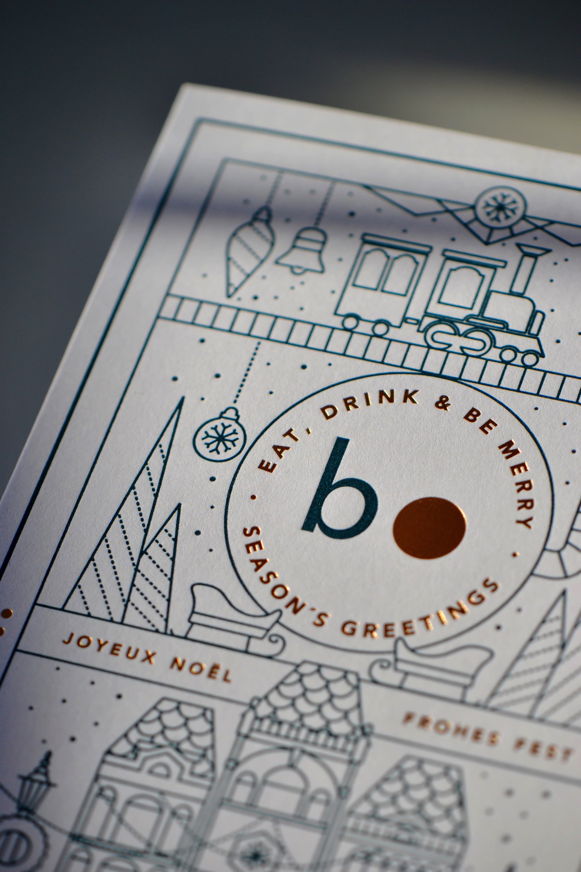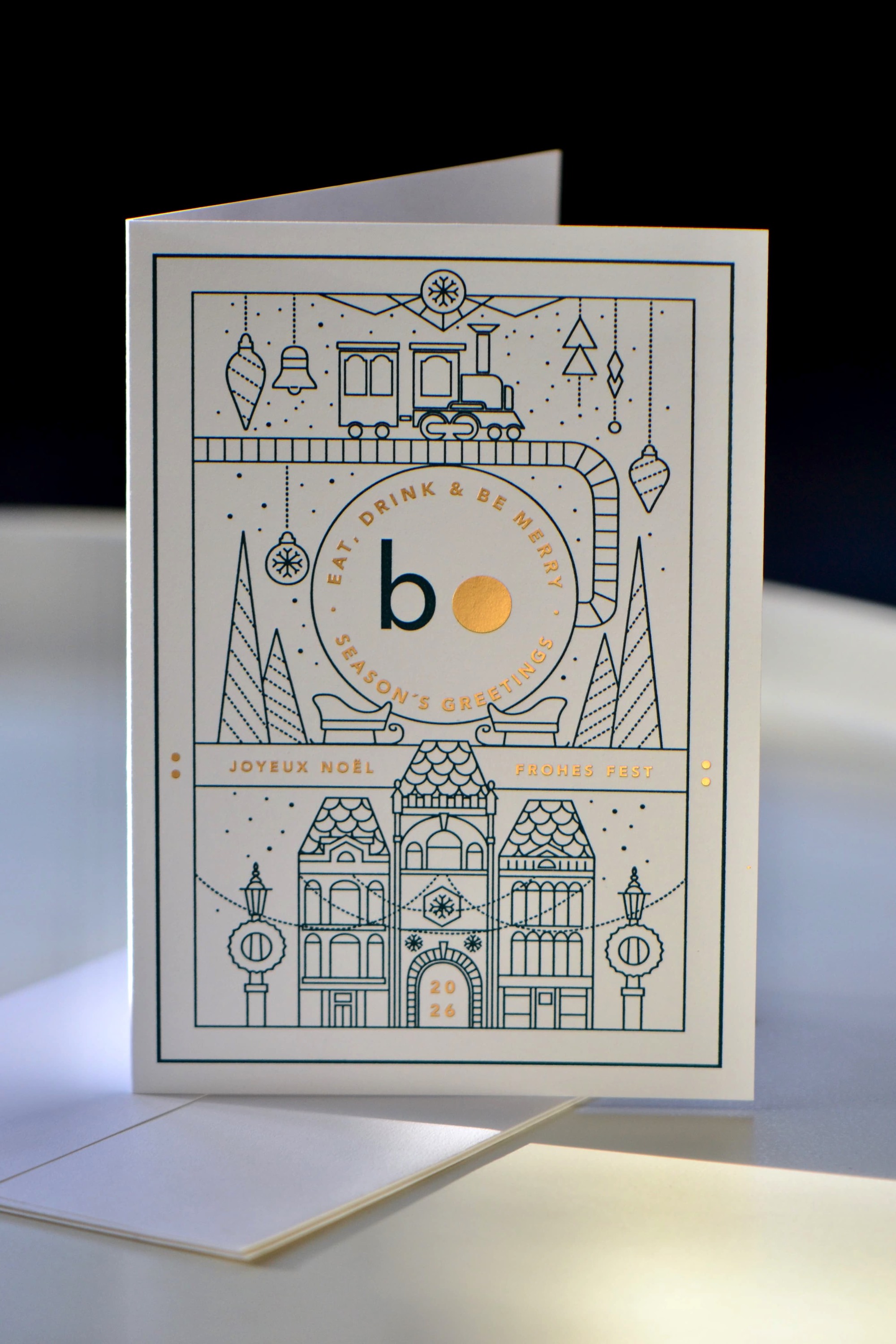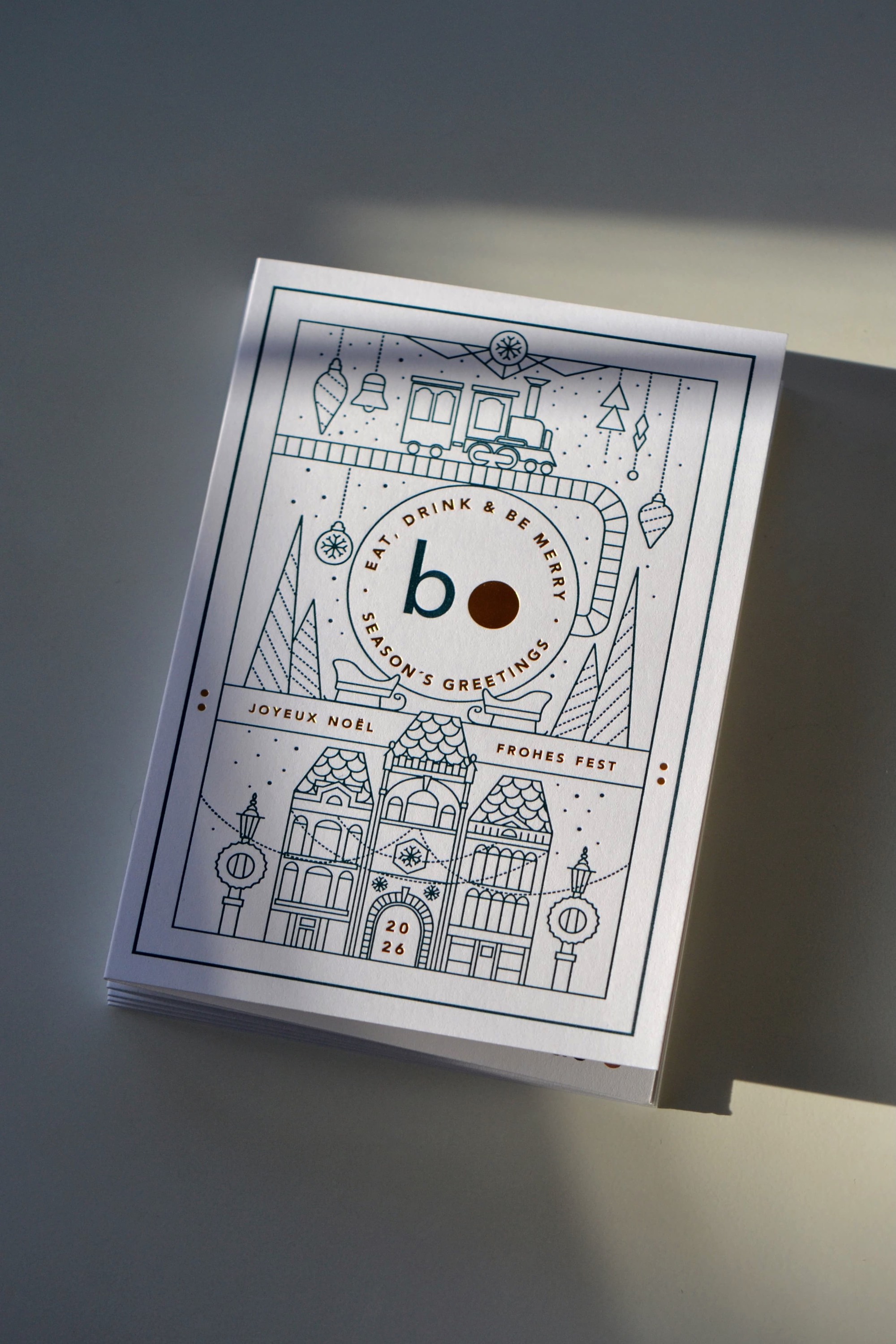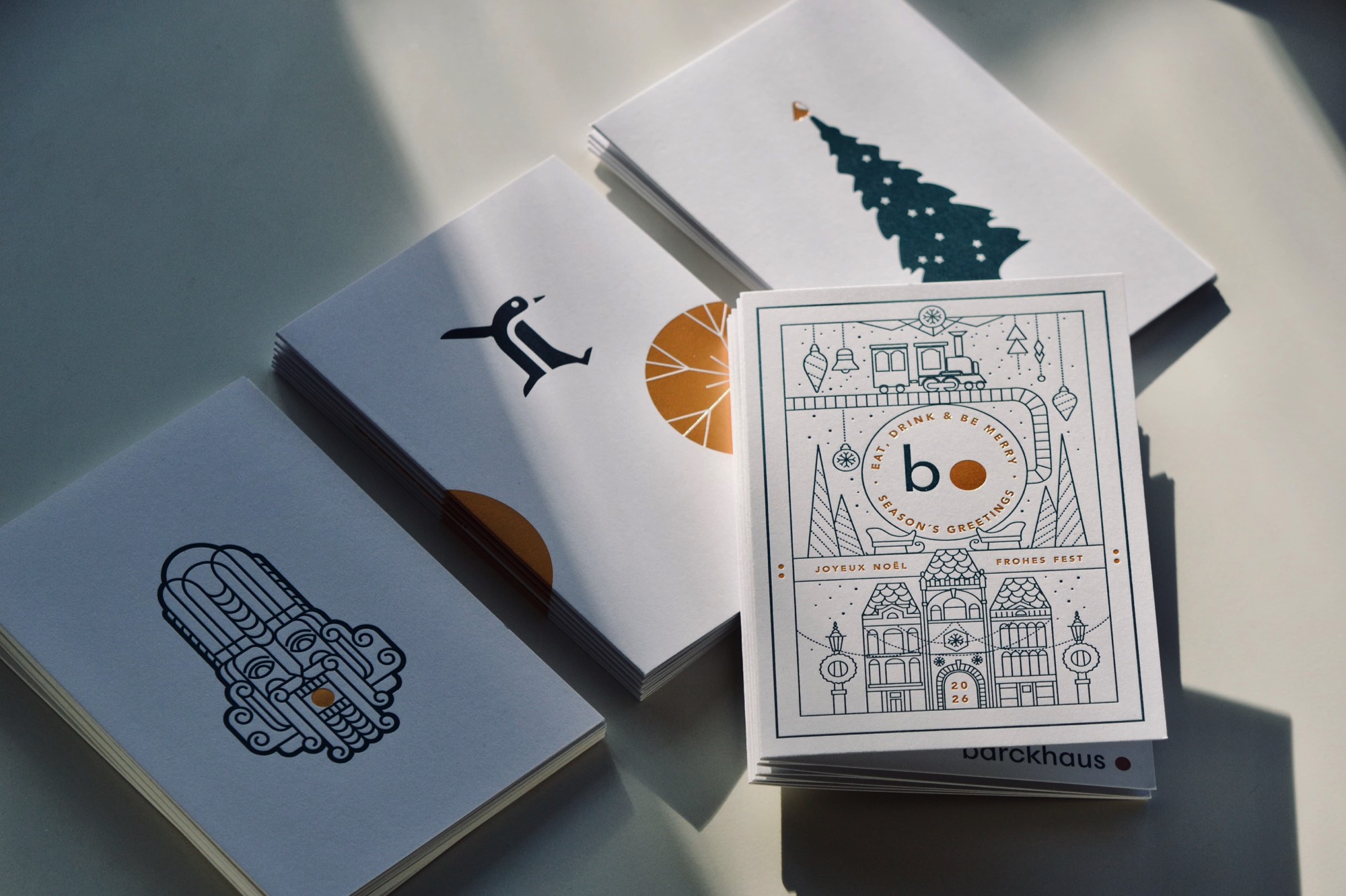 Eat, drink and be merry! Der Barckhaus Weihnachtsgruß 2025 gesellt sich in gelebter Tradition zu den exklusiven Barckhaus Weihnachtskarten der vergangenen Jahre. Weihnachtsmotive und Tyopografie laden zur Entdeckungsreise durch eine Winterlandschaft auf schneeweißem Feinstpapier ein. Diese hochwertigen Karten werden handwerklich produziert und gedruckt auf einer »Original Heidelberger Tiegeldruckpresse« von 1960. Ein Symbol der Wertschätzung.